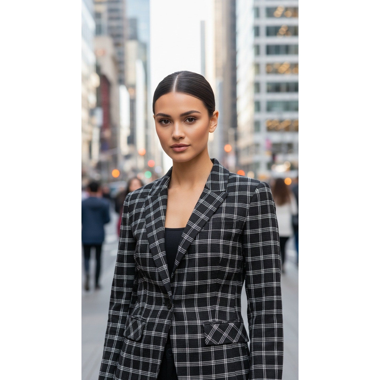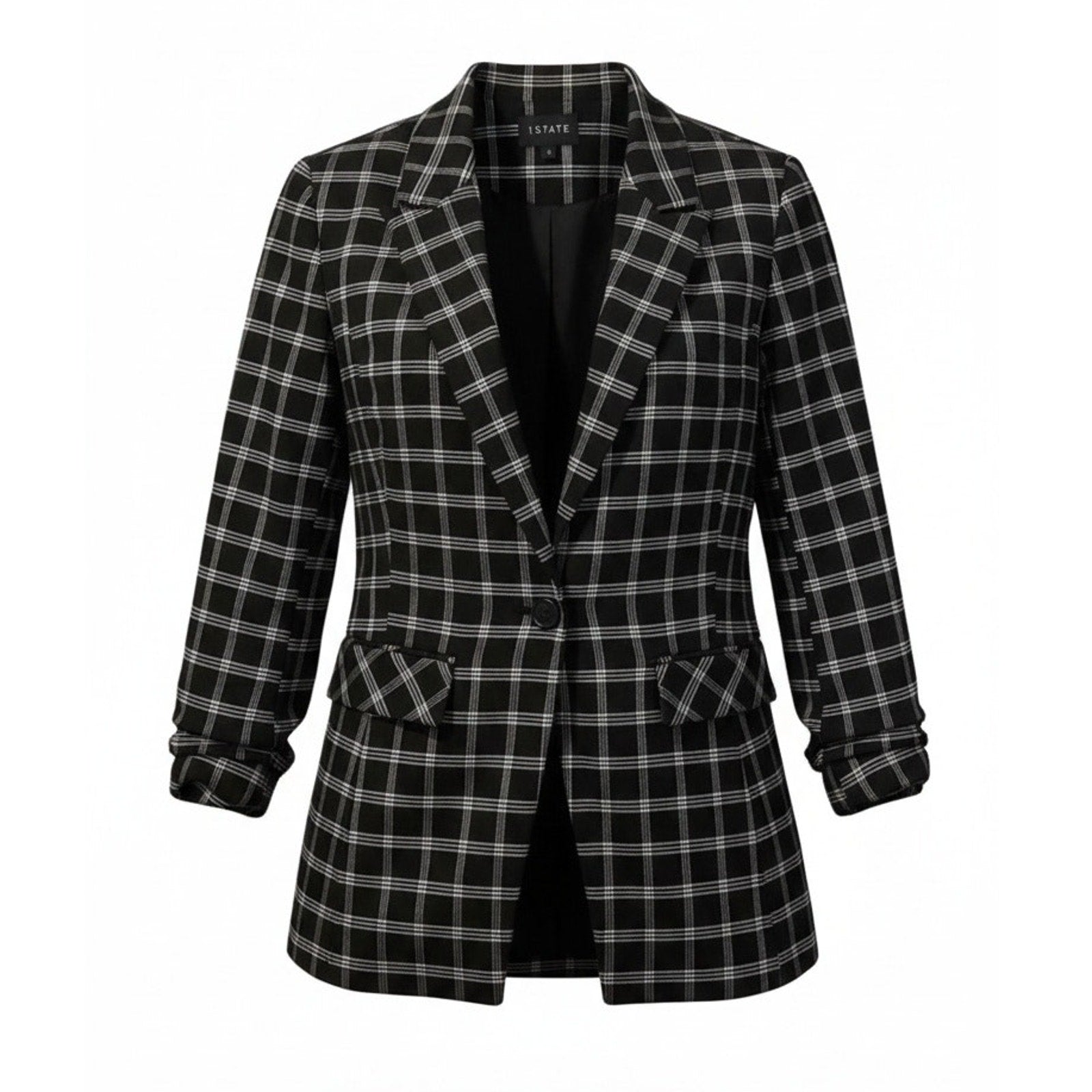 Keywords: 1.STATE blazer, women’s blazer size 6, windowpane plaid blazer, black and white blazer, one button blazer, notched lapel jacket, lined blazer jacket, office work blazer, business casual jacket, tailored blazer women, flap pocket blazer, classic workwear blazer, check pattern blazer, interview outfit blazer, smart casual blazer