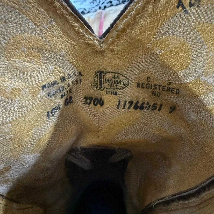 Keywords: Justin Boots, Western boots, men's leather boots, size 9 D, brown boots, cowboy boots, USA made boots, classic Western design, durable construction, intricate stitching, pre-owned boots, men's footwear, leather upper, Western style, men's fashion boots