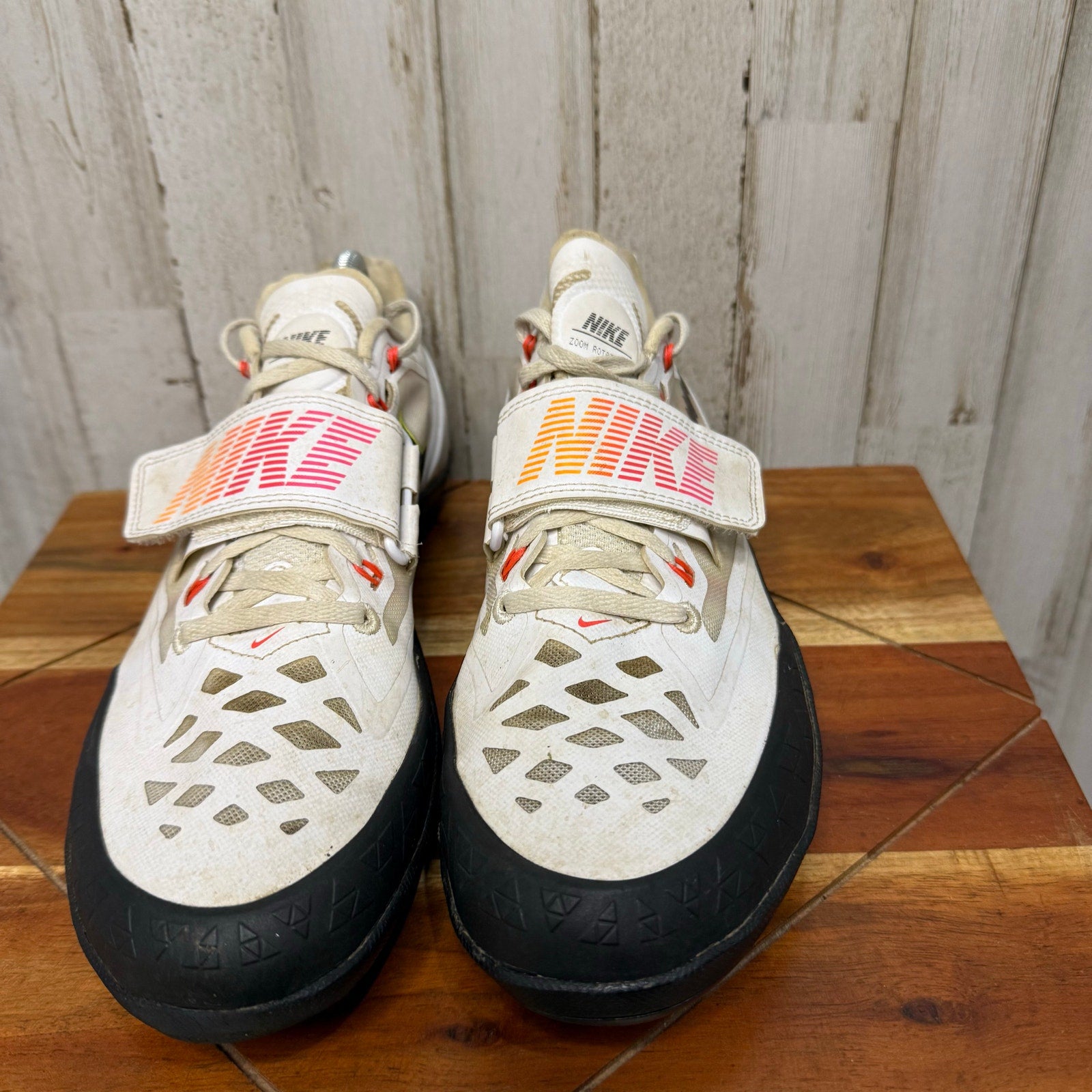 Keywords: Nike sneakers, Zoom Rotational 6, athletic shoes, unisex sneakers, white sneakers, low top sneakers, synthetic upper, lace-up closure, durable strap, rubber outsole, discus shoes, shot put shoes, hammer throw shoes, activewear sneakers, spring sneakers, pre-owned Nike shoes.