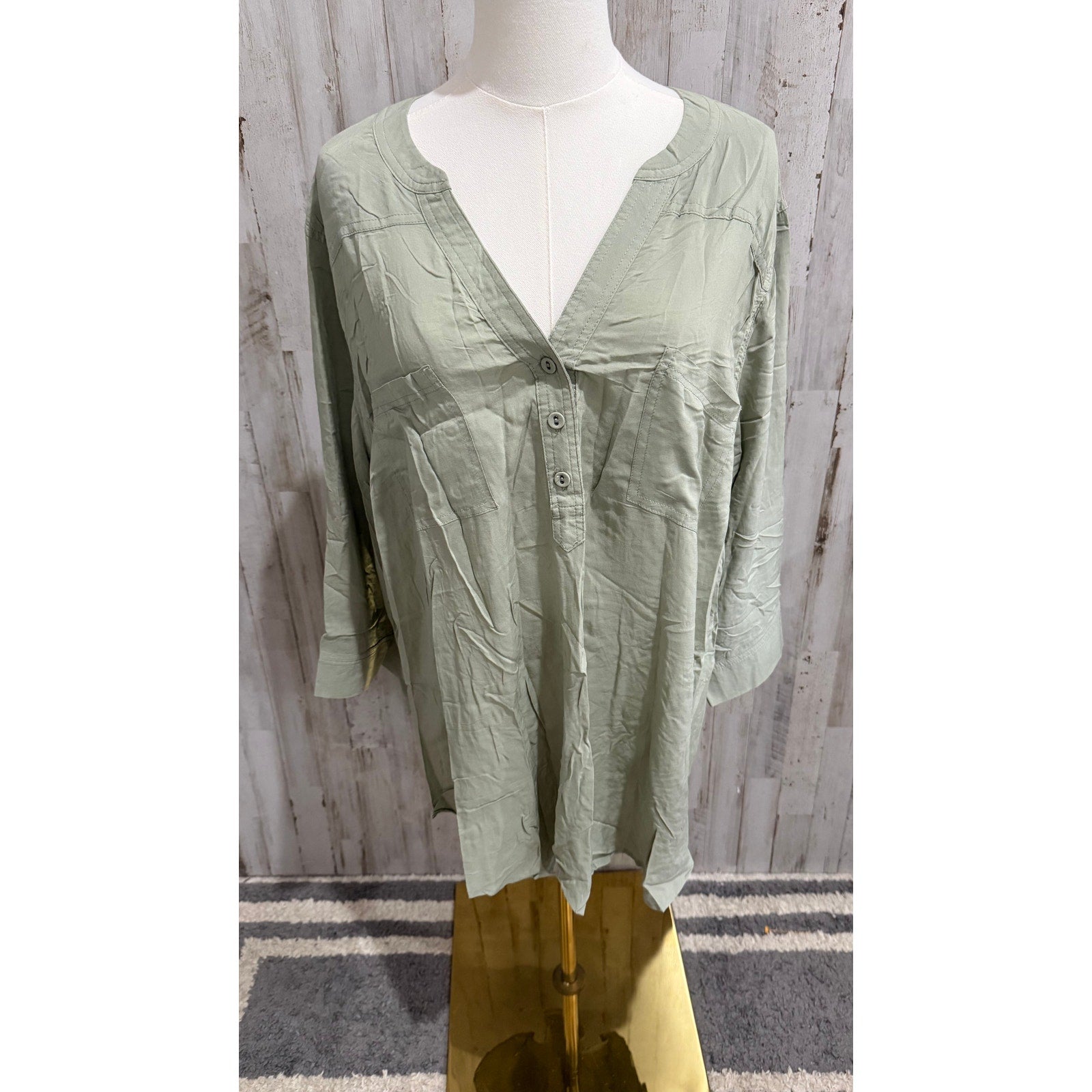 Keywords: philosophy woman blouse, republic clothing, plus size tunic top, 2x blouse, sage green top, rayon popover blouse, v neck tunic, roll tab sleeves, 3/4 sleeve blouse, lightweight drapey top, solid green blouse, chest pocket blouse, relaxed fit top, workwear blouse, casual tunic blouse