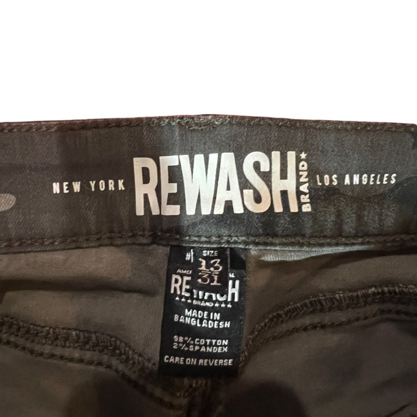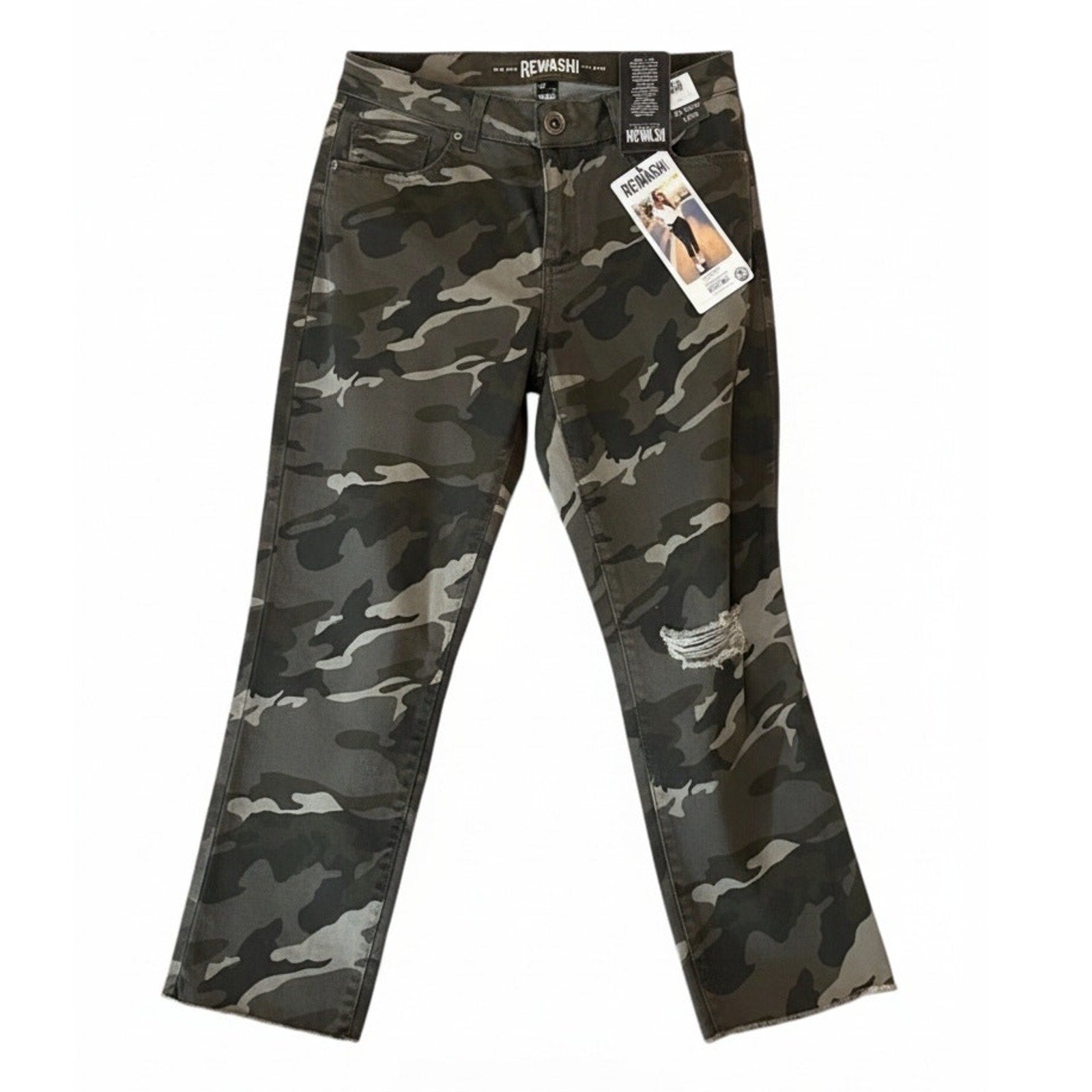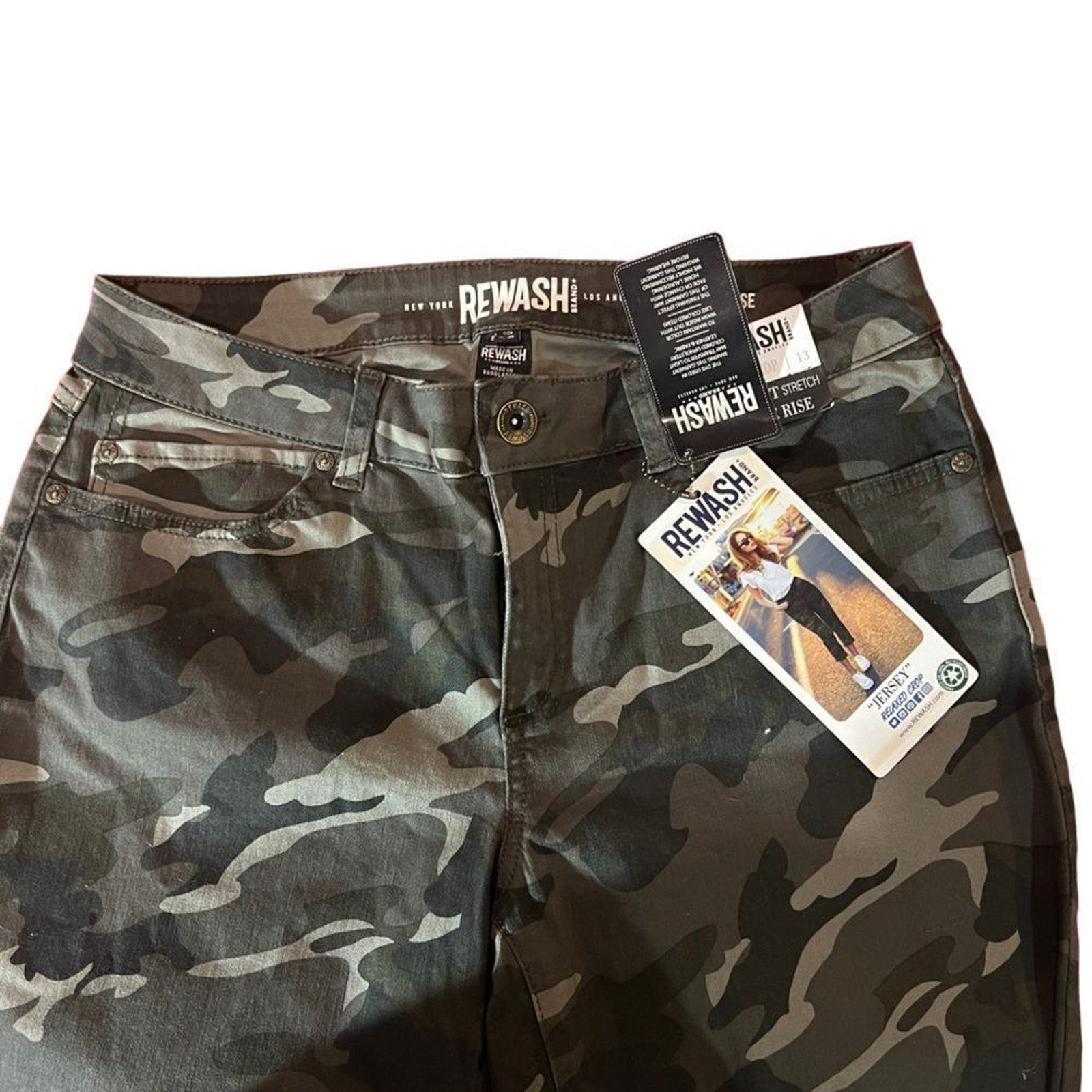 Keywords: Rewash Jersey jeans, camo jeans juniors, gray black camouflage denim, distressed straight jeans, raw hem jeans, comfort stretch denim, mid rise jeans, classic fit jeans, 5 pocket jeans, button zip fly jeans, juniors size 13 jeans, 31 waist jeans, streetwear jeans, casual camo pants, teen girls jeans