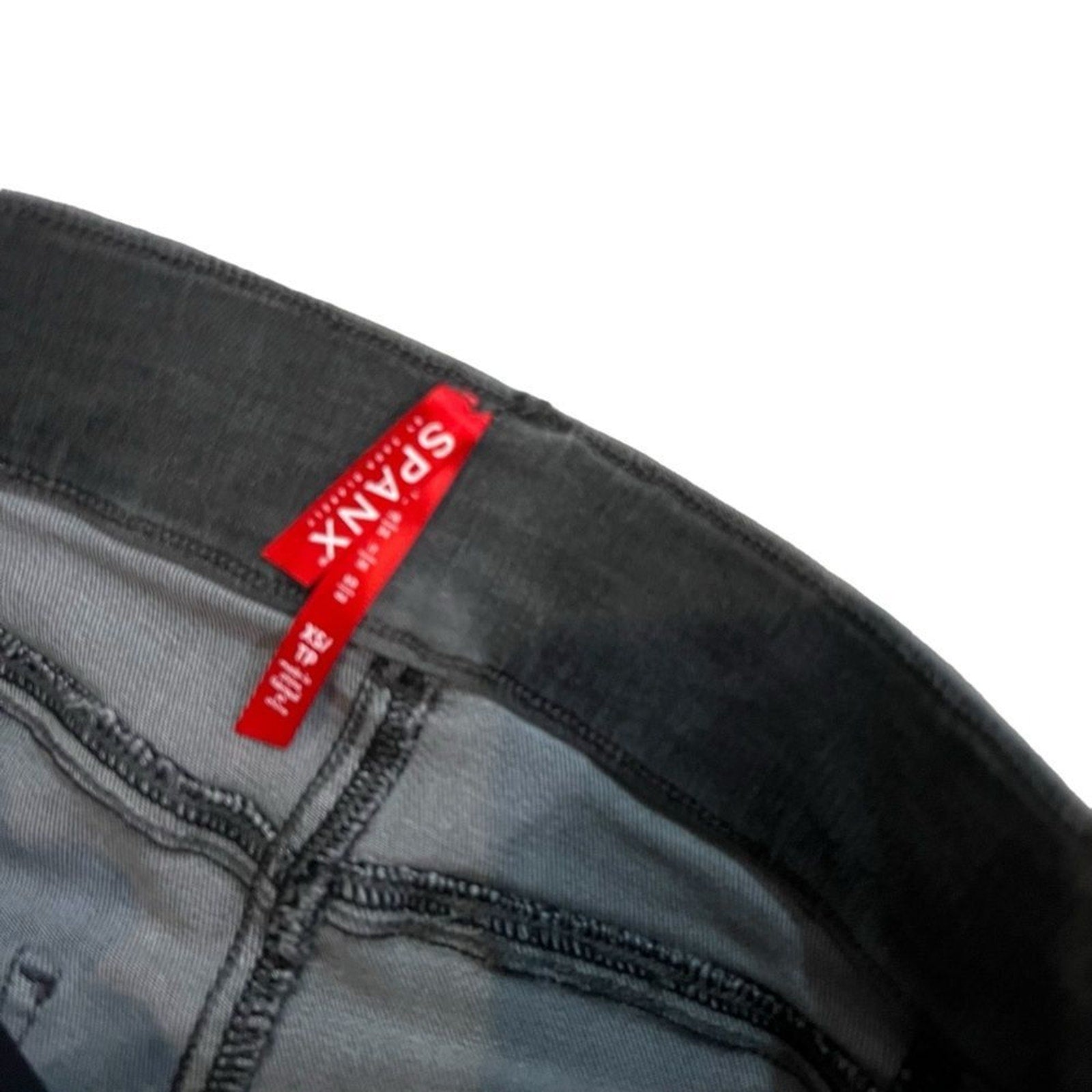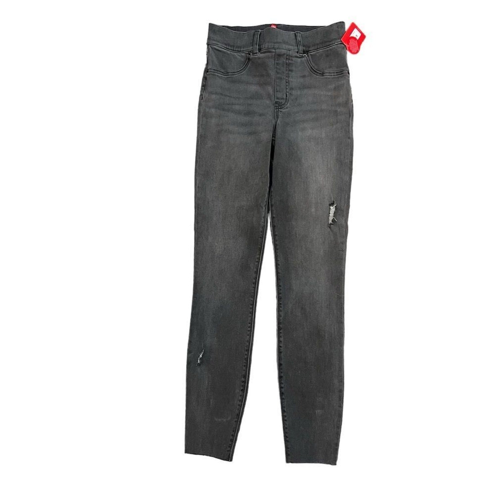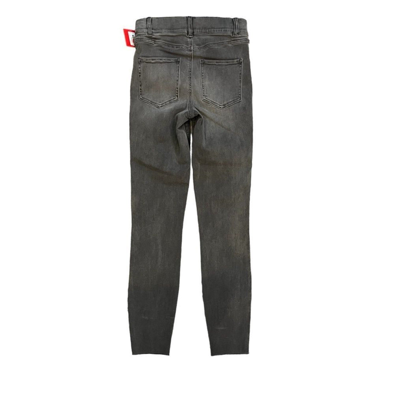 Keywords: SPANX jeans, distressed skinny jeans, vintage gray jeans, charcoal wash denim, high rise pull on jeans, shaping waistband jeans, slim fit stretch denim, ankle length skinny jeans, ripped gray jeans, women’s XS jeans, pull on denim leggings, faux pocket jeans, back pocket jeans, belt loop jeans, solid gray denim