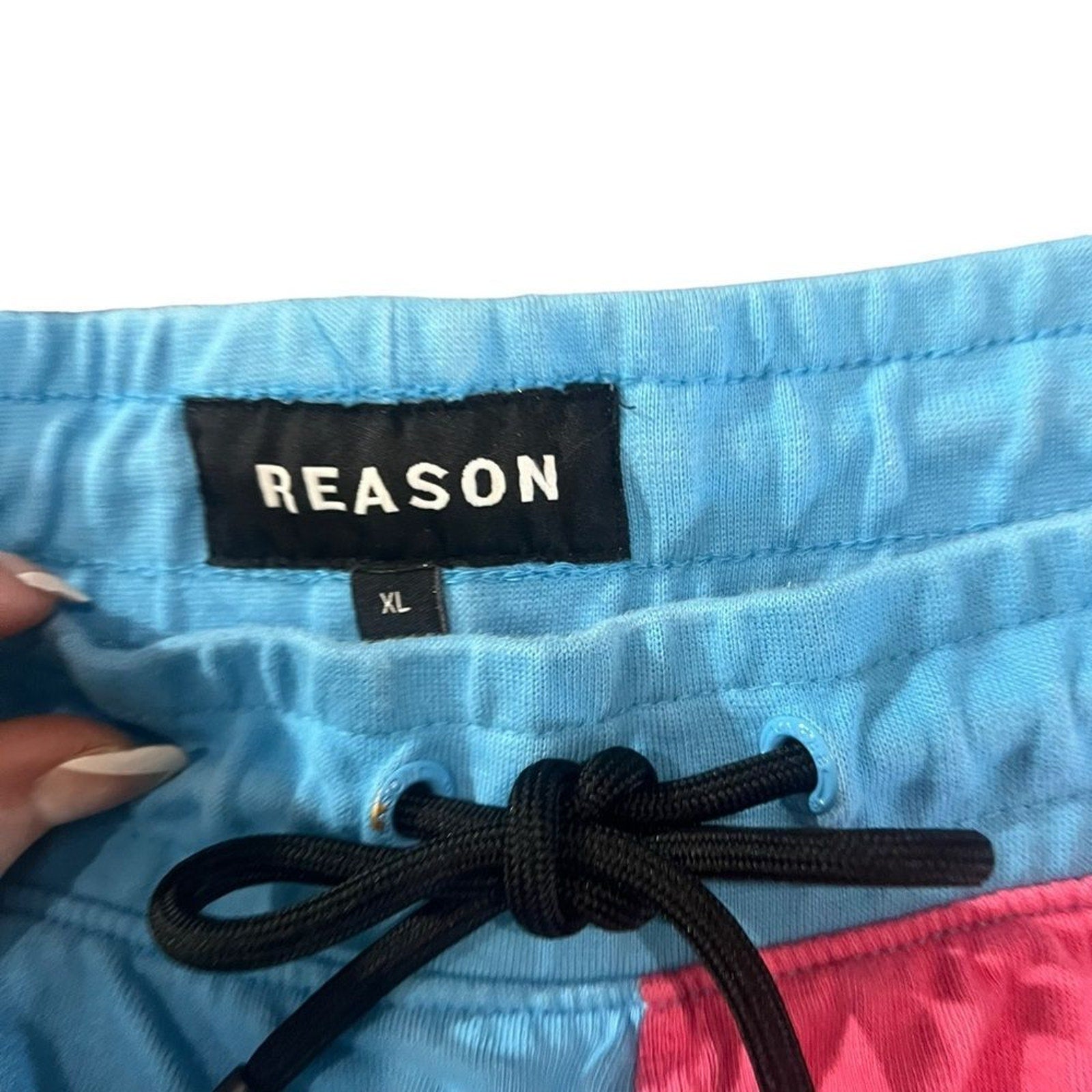 Keywords: Reason shorts, Live Fast shorts, men’s XL shorts, streetwear shorts, graphic print shorts, flame graphic shorts, star print shorts, two tone shorts, split color shorts, blue pink shorts, drawstring waist shorts, elastic waist shorts, casual summer shorts, festival streetwear, hip hop shorts
