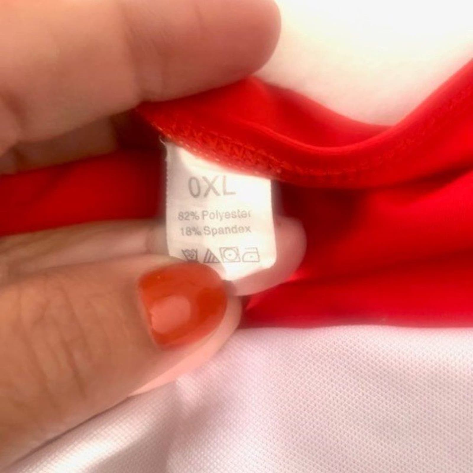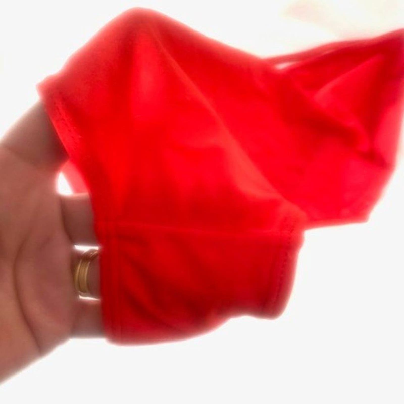 one is solid red and more high waisted (no manufacturer tag) - the other is rainbow stripe and has a V cut in front and back (from "No Boundaries").
