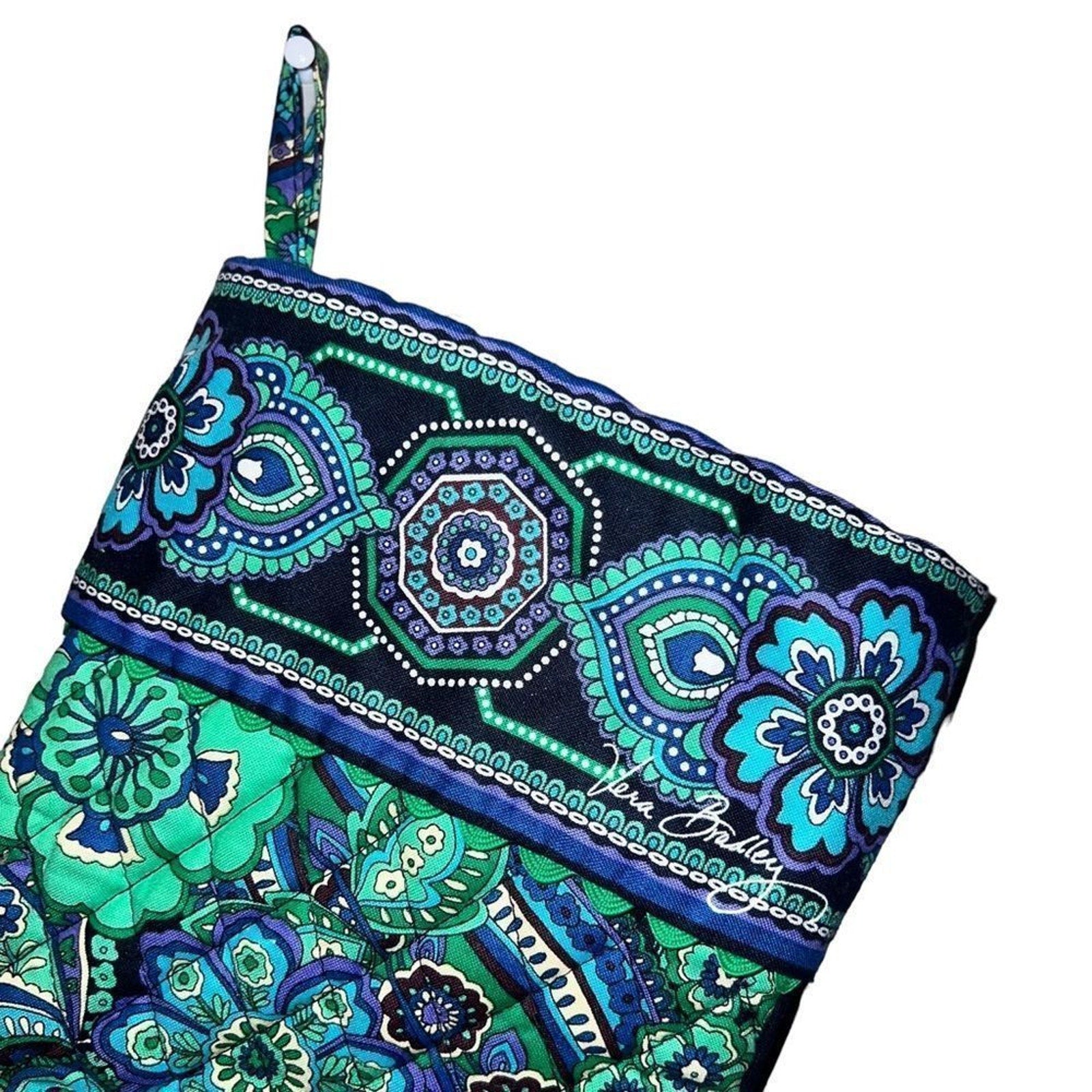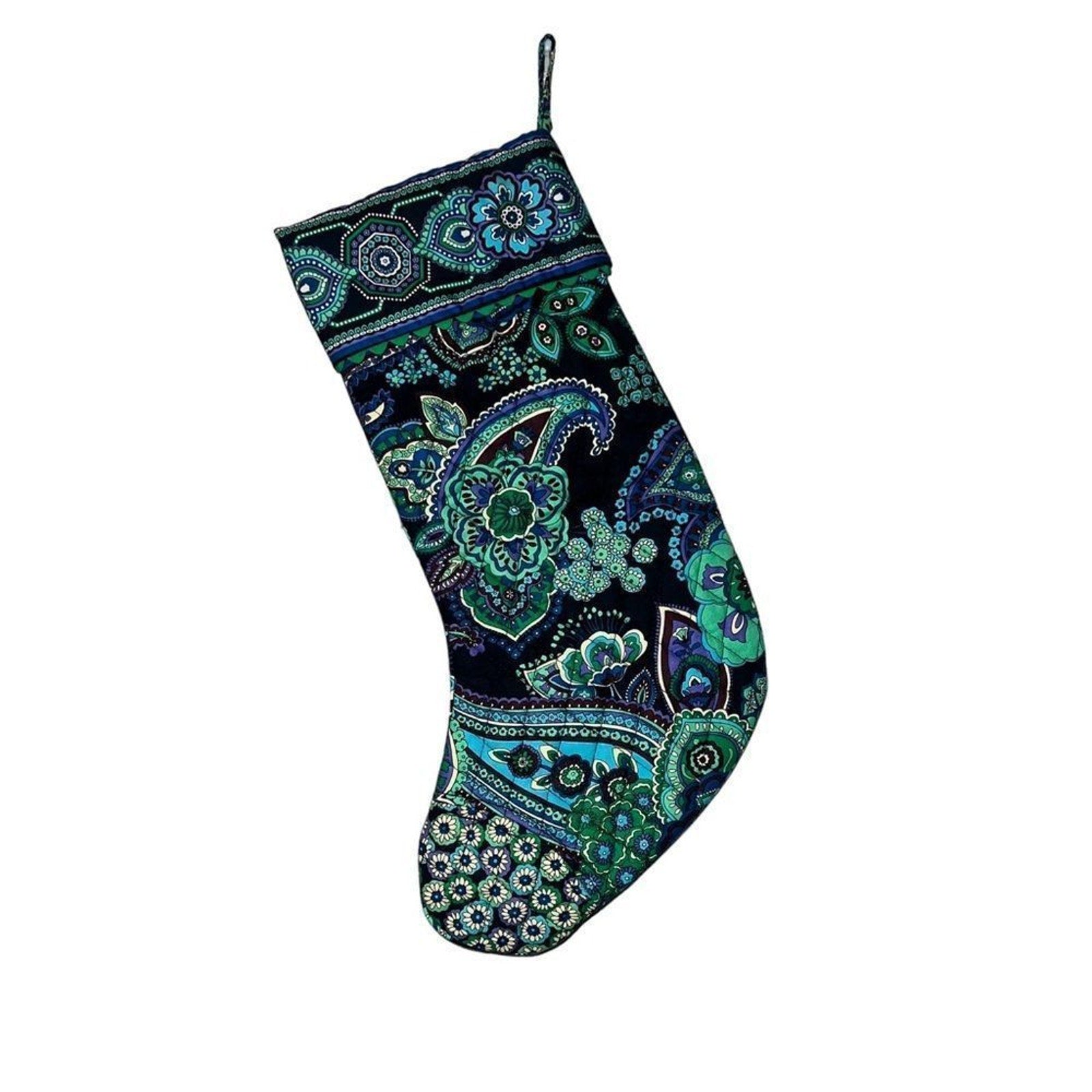 Keywords: Vera Bradley stocking, Blue Rhapsody, quilted Christmas stocking, floral paisley, holiday stocking, cotton stocking, hanging loop stocking, stocking with pocket, snap closure pocket, jingle bells stocking, designer holiday decor, mantel stocking, retired Vera Bradley pattern, Christmas decor, seasonal home decor