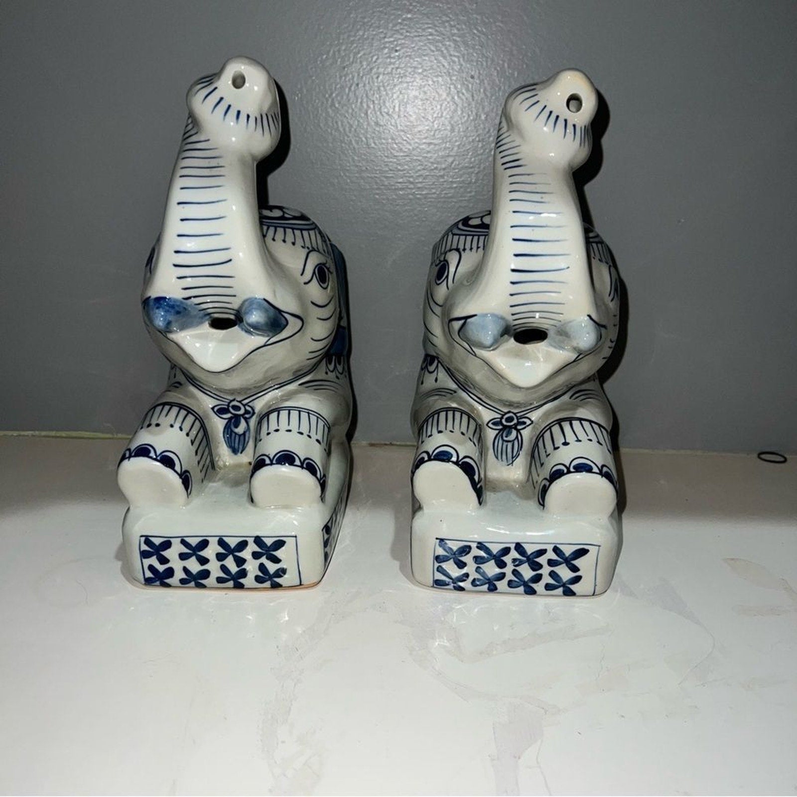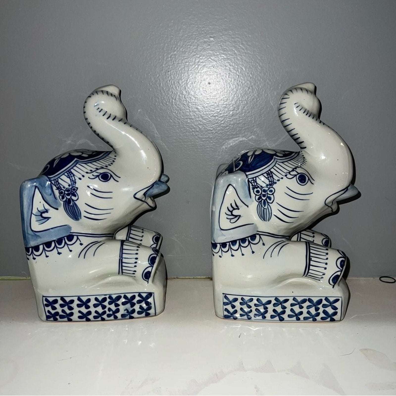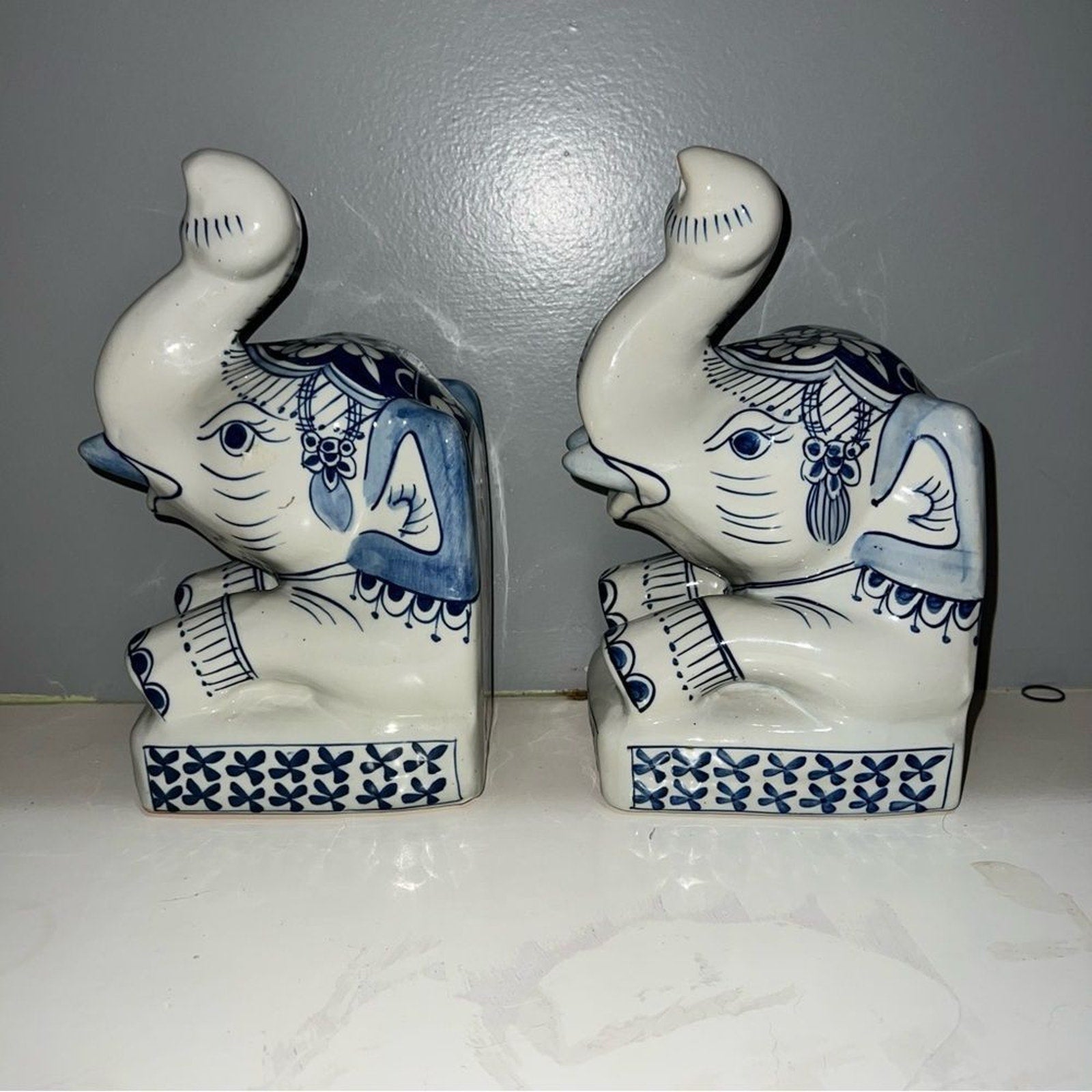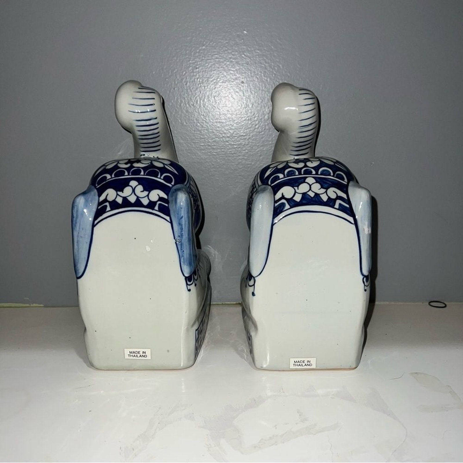 Keywords: Bombay Company bookends, blue and white elephant bookends, ceramic elephant decor, porcelain bookends set, chinoiserie bookends, Asian decor accents, Thailand ceramic elephants, glazed ceramic bookends, matching bookend pair, vintage style bookends, bookshelf decor, mantel decor, elephant figurine bookends, blue white porcelain decor, decorative bookends pair